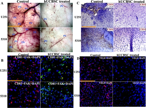 We also checked the expression of FAK in the control tumor and hUCBSC-treated tumor sections. For this, we did co-localization experiments with CD81 (mesenchymal stem cell marker) and FAK antibody. FAK was highly expressed in the control tumor brains as compared to hUCBSC-treated brain sections, which showed high expression of CD81 (Figure 5B). We then checked the expression of CD31 or PECAM-1 (Platelet Endothelial Cell Adhesion Molecule-1) in both control tumors of hUCBSC-treated mice brain sections. DAB immunohistochemistry revealed that CD31 was highly expressed in both U251 and 5310 control tumor brains, whereas in hUCBSC-treated mice brains, expression of CD31 was almost negligible (Figure 5C). Next, we checked for expression of VEGF in the brain sections. Control tumor sections showed high expression of VEGF in the tumor areas, whereas in hUCBSC-treated tumors, very low level of expression of VEGF was observed (Figure 5D). These results confirm that FAK and VEGF expression were highly downregulated in vivo in hUCBSC-treated tumor brains.