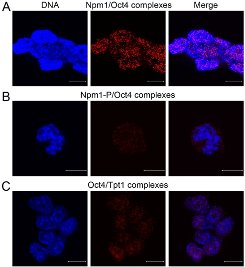 Oct4 is needed for maintenance of ES cells and iPS cell creation, but its relation to Npm1 and Tpt1, two factors found to be important for ES cell proliferation, have not been addressed and remained elusive. In situ proximity ligation assay (PLA) [17] is a powerful tool to screen rather easily for protein-protein interactions. Confocal micrographs collected at 0.38 μm intervals and merged together, show high number of Npm1/Oct4 complexes in the nucleoplasm of interphase ES cells (Figure 1A, each red dot represents one detected interaction). Interaction was also observed in mitotic cells using an antibody only recognizing Npm1 phosphorylated at residue T198 (Figure 1B, red dots). Oct4 also formed individual complexes with Tpt1 and a considerable number of Oct4/Tpt1 complexes are seen in the nucleus of interphase ES cells (Figure 1C, red dots).
