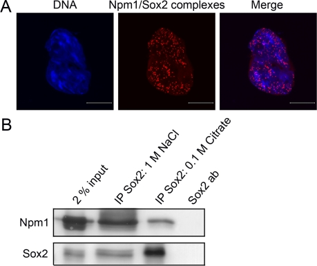 To further verify these results, extract prepared from ES cells was subjected to co-immunoprecipitation with anti-Sox2 followed by Western blot. Npm1 was co-immunoprecipitated with anti-Sox2 (Figure 2B, IP Sox2: 1 M NaCl and 0.1 M Citrate) but not with IgG control (data not shown).