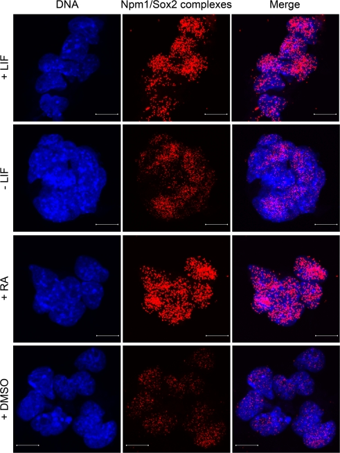 Both Sox2 and Npm1 protein levels are changing when ES cells start to differentiate. To investigate how the interaction is affected in the beginning of differentiation, ES cells were treated toward different differentiation pathways (retinoic acid, dimethyl sulfoxide and withdrawal of leukemia inhibitory factor) in combination with in situ PLA. Npm1/Sox2 complexes were shown to decrease when differentiation was induced by dimethyl sulfoxide or withdrawal of leukemia inhibitory factor (Figure 3). Conversely, such complexes remained, or even increased in number when differentiation was induced by addition of retinoic acid. This analysis showed that the Npm1/Sox2 interaction is reduced during conditions known to induce differentiation of ES cells into mesoderm and endoderm, whereas differentiation by retinoic acid into ectodermal lineage is induced in the continuous presence of Npm1/Sox2 complexes.