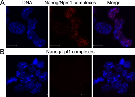 Confocal micrographs collected at 0.38μm intervals and merged together, showed that Nanog interacts with Npm1 (Figure 4A, red dots), whereas no interaction was seen between Nanog and Tpt1 (Figure 4B).