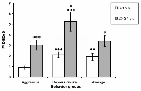 Figure 1 represents the molar ratios between F and DHEA-S levels (F/DHEA-S coefficient) in young and old female rhesus monkeys with different behavioral types. The lowest values for this coefficient in young animals with aggressive behavior significantly differed from those in animals of other behavioral groups. With ageing, the F/DHEA-S coefficient increased significantly in animals of all investigated groups. However, the highest values for this ratio were marked in old monkeys with depression-like behavior, and were significantly higher in comparison with those in animals with aggressive behavior. Furthermore in old aggressive animals the values of the molar ratios between F and DHEA-S levels equalized with those seen in old animals with average behavior, despite the minimal values for this coefficient in young aggressive animals.