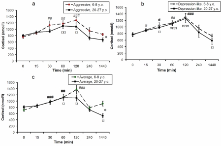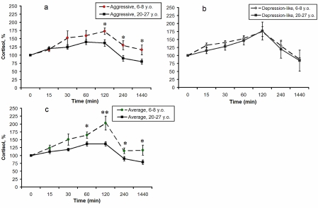 Additionally, in comparison with young monkeys, old animals of the first and third groups demonstrated a significantly lower increase (expressed as percentage increase) in F levels in response to immobilization, 120 minutes after stress initiation (p < 0.05 for aggressive animals; p < 0.01 for animals with average behavior, see Figure 3a, 3c). Besides, old animals with average behavior demonstrated a significantly lower increase in F concentrations in response to stress 60, 240 minutes and 24 hours after the onset of stress (Figure 3c), and old animals with aggressive behavior demonstrated a significantly lower increase of F 4 and 24 hours after onset of immobilization (Figure 3a). These data suggest a decrease in stress responsiveness of the HPA axis with ageing in animals with aggressive and average types of adaptive behavior. However, no significant age-related changes in plasma F were revealed for animals with depression-like behavior (Figure 3b).