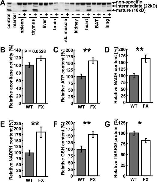 We subsequently moved on to investigate possible phenotypic changes in the heart, as this tissue usually displays the most profound aberrations in FRDA patients [14]. To investigate whether over-expression of frataxin in an animal model leads to similar changes in energy metabolism as previously reported in in vitro models [11,20], we determined activity of aconitase (Figure 1B), a Krebs cycle enzyme that is known to depend on ISC and hence frataxin expression. Moreover, aconitase catalyzes the initial conversion step of citric acid to isocitric acid in the Krebs cycle and therefore represents an important step of mitochondrial substrate oxidation. Animals over-expressing frataxin showed a trend towards elevated levels of aconitase activity when compared to wild-type littermates (Figure 1B) (P=0.0528).