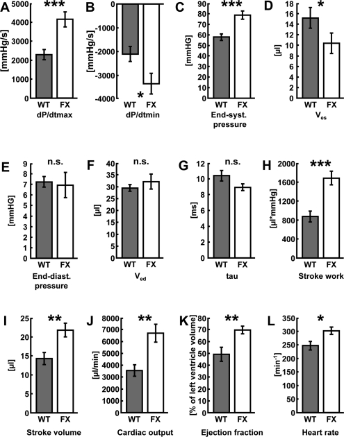 Left ventricular (LV) function was analyzed using pressure-volume loops. The animals were anesthetized (Thiopental 125 mg/kg i.p.), intubated, and artificially ventilated. As described recently [48], a 1.4 F micro-conductance pressure catheter (Sciesence, Ontario, Canada) was positioned in the left ventricle for registration of LV pressure-volume (PV) loops in a closed-chest model. Indices of cardiac function were derived from PV data. Systolic function was quantified by LV end-systolic pressure (LVP, mmHg), dP /dt max (mmHg/s) and by ejection fraction (EF, %). Global cardiac function was quantified by the end systolic volume (ESV, μl), end diastolic volume (EDV, μl) stroke volume (SV, μl), cardiac output (CO, μl/min), and heart rate (HR, beat/min). Diastolic function was measured by LV end-diastolic pressure (LVEDP, mmHg), dP/dt min (mmHg/s), and the iso-volumetric relaxation time TAU (ms).