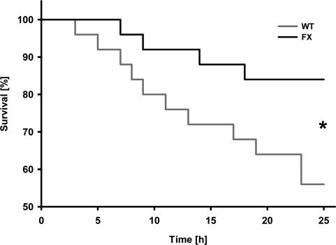 We investigated whether frataxin might contribute to improved function of the heart. Hemodynamic parameters of control and transgenic hearts was assayed to monitor cardiac performance of animals either left untreated or following DOX administration. In the basal state, no differences in any of the hemodynamic parameters could be observed when comparing wild-type and transgenic animals that had not received DOX (Table 1). However, when animals were challenged with DOX prior to the measurements, transgenic animals displayed markedly improved cardiac performance. Left ventricular contraction during systole and the ventricular relaxation during diastole, end-systolic and end-diastolic pressure (Pes and Ped) as well as maximum rate of left ventricular pressure rise (dP/dtmax) and fall (dP/dtmin) indicate contractility of the ventricle. Rates of ventricular pressure rise and decline were significantly improved in the hearts of transgenic animals (Figures 2A and B). A significant improvement was also observed in Pes and end-systolic volume (Ves) (Figures 2C and D). On the other hand, no changes could be detected in the equivalent end-diastolic functions end-diastolic pressure (Ped) and end-diastolic volume (Ved) (Figures 2E and F). Tau (τ), the time constant of iso-volumetric left ventricular pressure decline was not changed significantly (Figure 2G). On the other hand, parameters of overall cardiac performance, i.e. stroke work, beat volume, cardiac output, ejection fraction and heart rate were all significantly increased in hearts with frataxin over-expression following administration of DOX (Figures 2H-L). Most importantly and in accordance with these findings, we observed a significantly decreased rate of mortality in frataxin over-expressing animals compared to wild-type littermates after DOX exposure (P=0.033) (Figure 3).