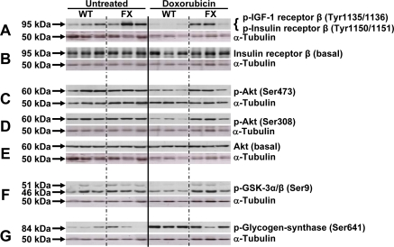 A close link exists between cardiac function and insulin signaling, as well as control of mitochondrial metabolism. We therefore quantified expression of components of the insulin signaling pathway in frataxin-transgenic animals before and after exposure to doxorubicin. Using immunoblotting, we analyzed expression and phosphorylation levels of IR and IGF-1R, as well as their downstream targets Akt (protein kinase B), glycogen synthase kinase-3α/β (GSK-3α/β) and glycogen synthase (GS). Expression as well phosphorylation levels of these proteins remained unchanged in frataxin-transgenic animals as compared to untreated controls in the pre-DOX state (Figure 4).