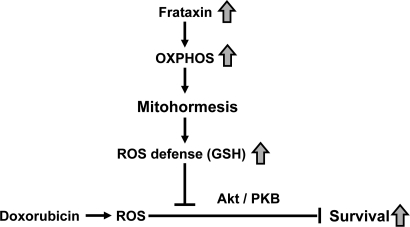 In summary, we observe a consistent reduction of insulin/IGF-1 receptor signaling and reduced Akt/PKB phosphorylation, which has been previously reported following administration of DOX. The findings altogether indicate that over-expression of frataxin, due to its function as an activator of mitochondrial energy metabolism, rescues the DOX-induced down-regulation of insulinIGF-1 signaling. Moreover, we propose that mitochondrial metabolism, by primarily producing increased amounts of ROS, elicits a mitohormetic response which activates defense mechanisms in the heart. This effect may help to prevent cardiomyopathy and result in improved survival following treatmentwith DOX (Figure 5). Plausible future approaches for finding novel treatments of CF would therefore include the search for novel compounds that can enhance mitochondrial metabolism to induce such a mitohormetic response [4].