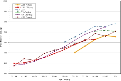 One of the most consistent differences noted was a lower pulse pressure in the LLFS probands and offspring. The LLFS offspring had levels similar to individuals who were 5-10 years younger. This difference was due in part to a higher DBP in LLFS, as well as a lower systolic pressure. A low DBP with aging is associated with vascular stiffness as diastolic pressure tends to go down as SBP increases with age [22]. Thus, a widening pulse pressure has been viewed as a sign of accelerated vascular aging and will be an important phenotype for future genetic analysis of exceptional survival. Less widening of pulse pressure with age would be consistent with, consistent with a slower “rate of aging” phenotype.