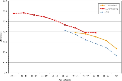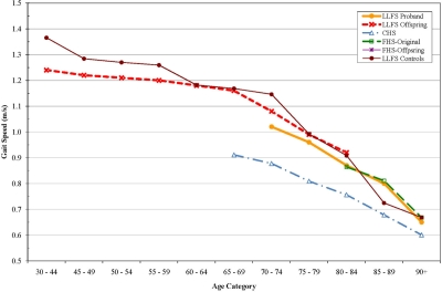 For the purpose of determining genetic contributions to longevity, “disability-free survival” as a phenotype may capture the joint effects of multiple chronic diseases of aging and the subject's ability to effectively deal with those diseases in order to maximize functional independence. Long Life Family Study participants had better physical functioning, based on assessments of gait speed and reported ADL difficulty. Physical functioning can be viewed as a summary measure of the impact of multiple conditions on health [24]. Gait speed differed between LLFS and other cohorts more than grip strength. This was unexpected given the robust ability of grip strength to predict mortality from middle age [24]. The grip strength protocol used in LLFS was slightly more difficult than used in the other cohorts and this may have obscured true differences. The Mini-Mental State Exam did not differ among these groups, but the measure used was designed to detect dementia and would be insensitive to detecting cognitive function differences within the normal range. More detailed analysis on a full battery of higher order cognitive function domains might reveal specific differences.