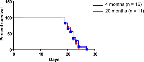 To determine the impact of host age on the survival of BCR-ABL+ leukemic cells, 1 x 105 cells of a characterized B-ALL cell line Ba/F3-p190 [19] were injected intravenously into syngenic host mice of 4 (n = 16) or 20 (n = 11) months of age. Injected mice started to die due to leukemic infiltration (data not shown) around 20 days post-injection. Kaplan-Meier survival plot demonstrates that there is no difference in survival between young or old recipient mice (log rank test P = 0.9011) (Figure 1). These results indicate that host age does not influence BCR-ABL+ ALLs malignancy.