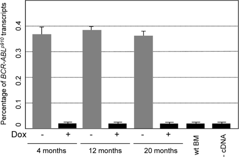 As mentioned, BCR-ABLp190+ ALLs have been identified as being originated in cells with the characteristics of a stem cell, and there are many evidences indicating that aging affects both the numbers and the functionality of stem cells and B lymphoid progenitors. Therefore, to investigate if the age of the target cells also has an impact in malignant development we have taken advantage of the doxycline-controlled transgenic CombitTA-BCR-ABLp190 mouse line [20] to induce the expression of the leukaemia-triggering oncogene in mice of different ages. The CombitTA-BCR-ABL-p190 mice expressing the BCR-ABLp190chimeric gene product have previously been described to consistently show the B-ALL pathologic phenotype with which this oncogene is associated in humans [20]. In the present work, BCR-ABLp190 expression was activated in CombitTA-BCR-ABLp190 mice of different ages (4-, 12- and 20-month, respectively) by removing the doxycycline from the drinking water. All mice demonstrated equivalent levels of exogenous BCR-ABL expression, thus precluding any effect from transgene expression changes with age (Figure 2).