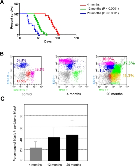 In order to test the age-dependent malignancy of transformed hematopoietic progenitor cells in vivo in the least biased manner possible, and to exclude any potential non cell-autonomous, age-related, effect on the disease evolution, bone marrow cells were purified from CombitTA-BCR-ABLp190 sacrificed mice in which BCR-ABL expression had been kept repressed all life. Then, cells from donors sacrificed at either 4-, 12- or 20-months were injected intravenously into syngenic host mice of 4 months of age. This transplantation into a non doxicyclin-treated recipient lead to transgene derepression and expression of the oncogene in a simultaneous manner. 100% of the injected mice developed B-ALL with all the phenotypic characteristics previously described for the CombitTA-BCR-ABLp190 mice [20], namely the presence in the peripheral blood of organ-infiltrating blast cells co-expressing B-cell and myeloid markers (Figure 3). However, B-ALL derived from 12- and 20-month transformed HSCs could be distinguished by two distinct but interrelated relevant features: first, 20-month-ALLs presented increased cellularity of B220, Mac1 co-expressing blasts (Figure 3B-C). Second, and most importantly, animals with B-ALL derived from 4-month-old donors survived nearly twice as long as those with B-ALL from 12- and 20-month-old donors (88 versus 50.5 and 33 days, respectively; log rank P < 0.0001 and 0.0001, respectively; Figure 3A). These findings therefore prove that the malignancy of B-ALL increases with the age of the leukemic-cell-of-origin (i.e., with the age of the normal progenitors from which the disease arises). Leukaemias originating from older progenitors present a more aggressive phenotype, and have a much faster evolution, than leukaemias initiating in young progenitors. Our results also show that, to a great extent, disease evolution is programmed from the beginning, since the starting cell determines the aggressiveness of the phenotype, and also that the decline of the immune response with age is not responsible for the increased development or aggressiveness of the tumours in the elderly. In agreement with these observations it has been recently shown, using a retroviral transduction system, that aged B-cell progenitors present a reduced fitness due to impaired signaling machinery and that this, since the oncogene covers in part the need for kinase signaling, promotes the positive selection for BCR-ABL+ cells [21].