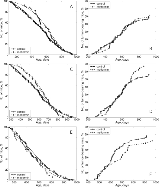 In our study, treatment with metformin did not affect total tumor incidence, but led to the increase in the mean life span of tumor-bearing mice. In contrast, the time of detection of the first tumor was mainly postponed in metformin-treated mice when such treatment has been initiated early and in the middle age.