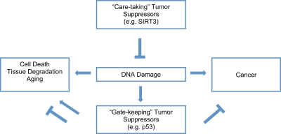 In contrast to the gate-keeping tumor suppressors, care-taking tumor suppressors maintain the stability of the genome and may simultaneously slow aging and prevent cancer. SIRT3 reduces oxidative stress, a major source of cellular and genomic damage, and may function as a gate-keeping tumor suppressor. Recently, it has been shown that deficiency of SIRT3 promotes transformation in-vitro in mouse embryonic fibroblasts (MEFs) [24]. Also, SIRT3-/- mice exhibit an increased risk of carcinogenesis in the mammary glands. Consistent with a causal role of oxidative stress in tumorigenesis in the absence of SIRT3, SIRT3-/- MEFs and mice have higher levels of oxidative stress and genomic instability. The level of oxidative stress could be brought down by increasing the activity of antioxidants, which suppressed transformation in SIRT3-/- MEFs. Thus, SIRT3 is emerging as a care-taking tumor suppressor that may alleviate aging and prevent cancer.