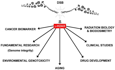 Potential practical uses of γ-H2AX foci formation in cells and tissues have been apparent from soon after its discovery. The amplified response makes it possible to easily visualize individual DSBs in cell nuclei, making γ-H2AX foci staining more sensitive than other methods of DSB detection [7]. The realization that DSBs, whether alone or as one type of a spectrum of DNA lesions, are involved in many processes that disturb cellular homeostasis has led to broadening use of γ-H2AX foci detection beyond basic research. It has been used as a biomarker for aging and cancer, and a biodosimeter for drug development, radiation exposure and for clinical trials for cancer chemo- and radiotherapy. Finally, other emerging uses for γ-H2AX include detection of toxic environmental agents and the detection of chronic inflammation (Figure 1). In this report we highlight recent advances in four areas utilizing γ-H2AX detection.