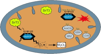 In this regard, we have recently shown in a manuscript published in Molecular Cell that MnSOD contains a reversibly acetylated lysine residue that is deacetylated by caloric restriction and 36 hours of fasting and MnSOD [41]. Purified MnSOD was also shown to be directly deacetylated by recombinant SIRT3 in an in vitro deacetylation assays and re-introduction of the wild-type, but not a deacetylation null, Sirt3 gene decreased MnSOD acetylation as well as increased MnSOD activity. These results strongly suggested that Sirt3 deacetylation activity directly directs MnSOD acetylation status as well as its enzymatic detoxification activity [41].
