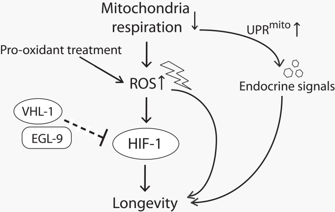 For the last two decades, many genes and pathways have been shown to regulate aging across phyla. Among these, impaired mitochondrial respiration extends the life span of yeast, C. elegans, Drosophila, and mice [1-10]. Although several studies have proposed underlying mechanisms by which diminished mitochondrial respiration promotes longevity, including gene expression changes, global metabolic shift, and changes in energy utilization [11-15], the key genetic factors that mediate this long life span were poorly understood. We proposed that longevity caused by inhibition of mitochondrial respiration in C. elegans is promoted by HIF-1 activity via reactive oxygen species (ROS) [16]. Here, we discuss recent findings regarding the roles of HIF-1, ROS, and mitochondrial respiration in the regulation of aging.