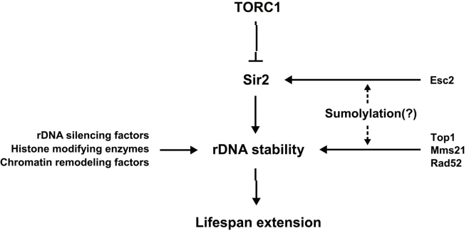 Aging and longevity have always been an important issue in biological sciences. Several reports have indicated that calorie restriction leads to lifespan extension from yeast to humans [1-3]. Longevity effect is also seen when nutrient-sensing signaling pathways such as the target of rapamycin (TOR) pathway and insulin/IGF pathway are inhibited [4-7], and the molecular mechanisms that regulate these nutrient-dependent pathways can substantially promote longevity in various organisms and mammalian cells [8-13]. The budding yeast Saccharomyces cerevisiae provides valuable information on understanding aging process and identifying the molecular mechanisms that regulate longevity in eukaryotic organisms. Two types of aging, replicative and chronological, have been described in S. cerevisiae. Replicative aging is an aging model of mitotically active cells in which the lifespan of a mother cell is measured by the number of daughter cells produced before death [14, 15]. Chronological aging is an aging model of post-mitotic cells in which lifespan is defined by the survival time of cells in a non-dividing state [16]. In S. cerevisiae, a well-established mechanism for regulating longevity is the alteration of ribosomal DNA (rDNA) stability by the recombination between rDNA repeats and the accumulation of extrachromosomal rDNA circles (ERCs) [17]. Recently, we confirmed that the inhibition of TOR pathway stabilizes rDNA locus by enhancing the association of silent information regulator 2 (Sir2) with rDNA, thereby leading to replicative lifespan extension in S. cerevisiae [18]. In this research perspective, we review the implication of rDNA stabilizers in longevity regulation, discuss how Sir2 stabilizes rDNA under TOR inhibition and speculate on the link between sumoylation and Sir2-related aging pathway.