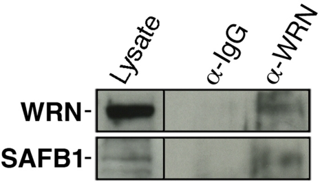 Recent mass spectrometry analyses in our laboratory indicated a potential interaction between WRN and SAFB1 proteins [28]. To confirm this result, we immunoprecipitated the WRN protein from HEK 293 cells and analyzed the immunoprecipitate with an antibody against SAFB1. As indicated in Figure 1, SAFB1 protein was co-immunoprecipitated with an antibody against the WRN protein but not with a control IgG. We were unable to immunoprecipitate the SAFB1 protein with the commercial antibody used in this study (data not shown).