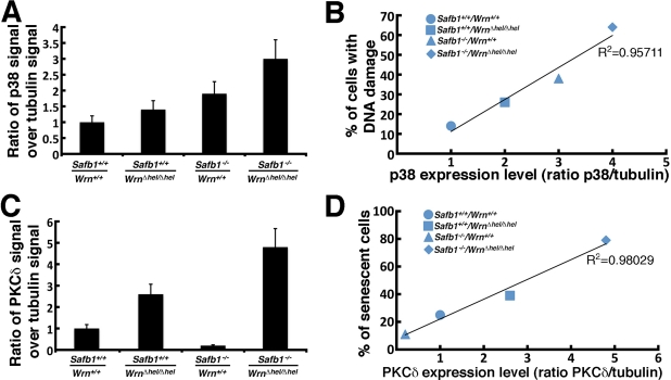 We recently reported that a depletion of WRN protein in human cells increase PKCδ activity in vitro[45]. In the present study, we found a significant increase in PKCδ protein levels in WrnΔhel/Δhel MEFs. This result is consistent with the increased PKCδ protein levels found in liver tissues of WrnΔhel/Δhel mice compared to wild type animals [29]. In addition, we found that PKCδ levels were higher in Safb1-null/WrnΔhel/Δhel cells. In contrast, Safb1-null MEFs showed lower levels of PKCδ compared to wild type cells. More importantly, there was a near perfect correlation between PKCδ levels and the percentage of positive β-galactosidase stained cells depending on the genotype of the MEFs under study (Pearson's correlation coefficient R2 > 0.98 in Figure 10D). This is a significant finding, as PKCδ plays a key role in the induction of senescence in human breast tumor cells and normal human diploid fibroblasts [37, 38, 46]. The very high levels of PKCδ in Safb1-null/WrnΔhel/Δhel cells is independent of cellular DNA damage levels as Safb1-null MEFs have on average more double strand breaks than wild type and WrnΔhel/Δhel MEFs. In contrast, the p38 MAP Kinase correlated very well with the amount of DNA damage within each different MEF genotype (Pearson's correlation coefficient R2 > 0.95 in Figure 10B). This is consistent with the observation that p38 is activated in both a p53 dependent and independent manner after DNA damage [47]. Finally, JNK1 level was increased only in MEFs lacking the Wrn helicase activity and this independently of the Safb1 status in cells (Figure 8). These results suggest that the increased expression of PKCδ play a major role in the induction of senescence in MEFs. Additional studies are warranted to determine whether PKCδ inhibits immortalization of Safb1-null MEFs and what is the exact molecular mechanism affected in the process.