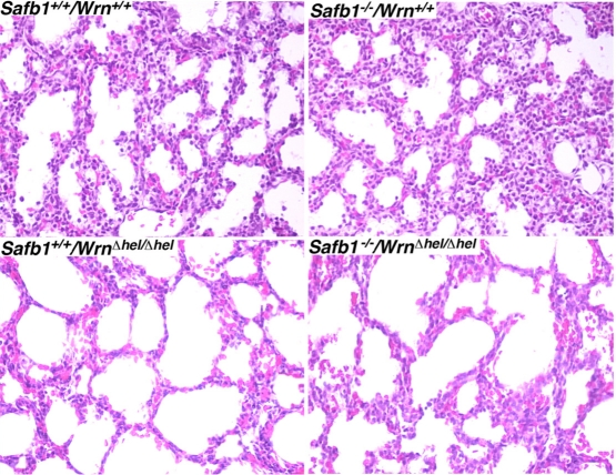 In this study, we examined the impact of a defective Wrn protein (helicase dead Wrn protein) on the phenotype of Safb1-null embryos in vivo and in cultured cells. We found increased perinatal death in double homozygous mutant mice concomitantly with significant apoptosis in the lungs of such animals. Lastly, we found lack of immortalization of Safb1-null MEFs in the absence of a functional Wrn helicase protein in vitro.