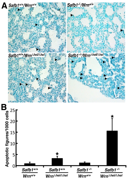 The major phenotype of Safb1-null dying pups is the incomplete maturation of the alveoli in the lungs [26]. As indicated in Figure 2, the interalveolar septa of Safb1-null pups were larger than those observed in wild type animals. The lack of a functional Wrn helicase caused a decrease in the thickness of the interalveolar septa in Safb1-null live pups at birth (compare top and bottom right panels of Figure 2). To get a better quantification of the lung phenotype, we first examined the level of apoptosis in lung tissues using a TUNEL apoptosis kit. TUNEL assays were performed on the lungs of 19 days old embryos. The number of apoptotic cells was estimated on lung sections of three embryos for each genotype (Figure 3A). This number was nearly 16-fold higher in Safb1-null/WrnΔhel/Δhellung samples than in wild type and Safb1-null samples (unpaired student t-test P-value < 0.05 compared to wild type Wrn+/+/Safb1+/+embryos) (Figure 3B). The number of apoptotic cells in the lungs of 19 days old WrnΔhel/Δhelembryos was approximately three-fold higher than in the lungs of wild type animals (Figure 3B). There was no significant increase in apoptotic figures in the lungs of Safb1-null mice compared to wild type animals. These results indicate that there was more cell death in the lungs of Safb1−/−/WrnΔhel/Δhel embryos at birth than the other genotypes. Cell death was homogeneously distributed across the whole embryonic lung tissue of Safb1-null/WrnΔhel/Δhelindividuals.