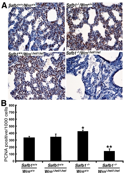 Cell proliferation was also examined in the lungs of 19 days old embryos with an antibody against the proliferation cell nuclear antigen (PCNA). As indicate in Figure 4, the number of PCNA positive stained cells in the lungs of Safb1-null mice was 27% greater than in the lungs of wild type animals (unpaired student t-test P-value < 0.001 compared to wild type Wrn+/+/Safb1+/+embryos). In contrast, the number of PCNA positive cells in the lungs of Safb1−/−/WrnΔhel/Δhel embryos was 42% lower than wild type animals (unpaired student t-test P-value < 0.0001 compared to wild type Wrn+/+/Safb1+/+embryos). These results indicate that a deficiency of SAFB1 increased pulmonary cell proliferation, but a deficiency in both Safb1 and Wrn functions significantly decreased cell proliferation and increase cell death in the lungs of mutant embryos. We conclude that the Wrn helicase is required for cell survival and proliferation in the lungs of Safb1-null animals.