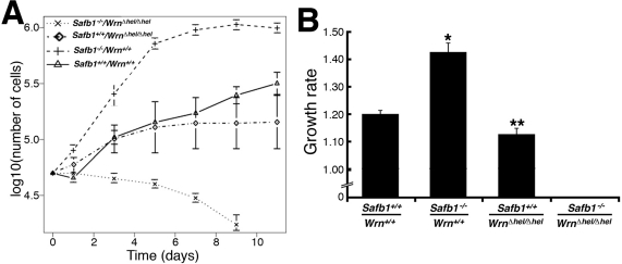 Because reduced growth rate is a property associated with WrnΔhel/Δhel MEFs [32], we examined this property in fibroblasts derived from Safb1−/−/WrnΔhel/Δhel double homozygous mutant embryos. We thus measured the average growth rate of MEFs from three embryos of each genotype in culture (after seven to ten passages in culture) (Figure 5). The growth rate of Safb1-null MEFs was significantly greater than wild type MEFs (unpaired student t-test P-value < 0.000001) even after 24 passages in culture (Figure 5B). The calculated doubling time for Safb1-null and wild type cells were 34 and 40 hours, respectively. Safb1-null MEFs also reached a higher density at confluence than wild type cells (Figure 5A). WrnΔhel/Δhel MEFs had a lower growth rate than wild type MEFs (unpaired student t-test P-value < 0.026). The calculated doubling time for WrnΔhel/Δhel MEFs was 43 hours. Finally, Safb1−/−/WrnΔhel/Δhel double homozygous mutant cells did not grow after seven passages in culture and were detaching from the petri dishes (Figure 5A). All these results indicate that the Wrn helicase is required for the immortalization of Safb1-null MEFs in culture.