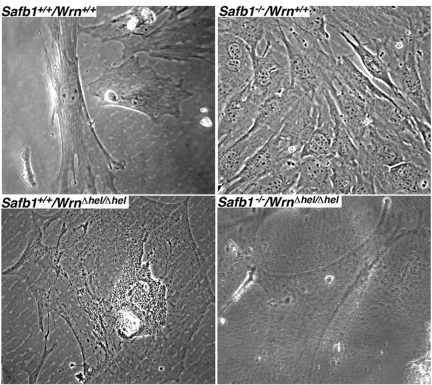 Since the cell density at confluence between Safb1-null and wild type MEFs were different, we examined the cellular morphology of each genotype with a phase contrast microscopy (Figure 6). All the MEFs were examined after the fifth passage in culture. WrnΔhel/Δhel MEFs were much bigger and flatter than wild type cells (compare top and bottom left panels of Figure 6). Safb1-null MEFs were smaller on average than wild type cells (top panels of Figure 6). Safb1−/−/WrnΔhel/Δhel MEFs were bigger than Safb1-null cells but not as big as WrnΔhel/Δhel MEFs in culture. These preliminary microscopic observations suggest that cells lacking a functional Wrn helicase had the morphology of senescent cells in culture and this independent of the Safb1 status.