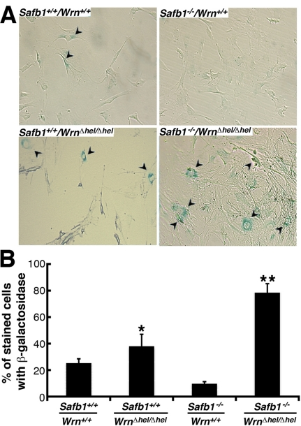 Replicative senescence of primary fibroblasts in vitro consists in the progressive loss of cell division abilities with cellular morphological changes and the accumulation of senescence-associated β-galactosidase activity [33]. We thus compared the number of senescence-associated β-galactosidase positive MEFs of each genotype after the fifth passage in culture. As seen in Figure 7A and B, loss of Wrn helicase activity strongly induced senescence-associated β-galactosidase activity in Safb1-null MEFs. The percentage of WrnΔhel/Δhel MEFs stained with the senescence-associated β-galactosidase was increased significantly by approximately 1.6-fold compared to wild type cells (unpaired student t-test; P < 0.022). Finally, the percentage of Safb1−/−/WrnΔhel/Δhel MEFs stained with the senescence-associated β-galactosidase was increased by three-fold compared to wild type cells (unpaired student t-test; P < 0.045).