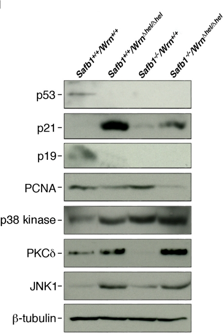 Mouse embryonic fibroblasts were lysed in RIPA buffer (50 mM Tris HCl (pH 7.5), 150 mM NaCl, 1% NP-40, 0.1% SDS, 0.5% deoxycholate) for immuno-precipitation and Western blot analyses. A goat polyclonal antibody against WRN (C-19) (Santa Cruz Biotechnology, Santa Cruz, CA) was used for immunoprecipitation and a rabbit polyclonal anti-WRN antibody from US Biologicals (Cleveland, OH) was used for the immunoblots. Rabbit polyclonal antibodies against the phsophorylated and unphosphorylated forms of the p38 MAP kinase were purchased from Cell Signaling Technology (Danvers, MA). A rabbit polyclonal antibody against JNK1 was purchased from AbCam (Cambridge, MA). A mouse monoclonal antibody against SAFB1 was purchased from Upstate Biotechnology (Lake Placid, NY). A horseradish peroxidase conjugated anti-p53 antibody (DO-1), a rat monoclonal antibody against p19(Arf), and a rabbit polyclonal antibody against PKCδ were purchased from Santa Cruz Biotechnology (Santa Cruz, CA). A rabbit polyclonal antibody against p21(Waf1) was purchased from Oncogene Research Products (Boston, MA). Horseradish peroxidase conjugated secondary antibodies and ECL reagents were from Amersham Biosciences (Piscataway, NJ).
