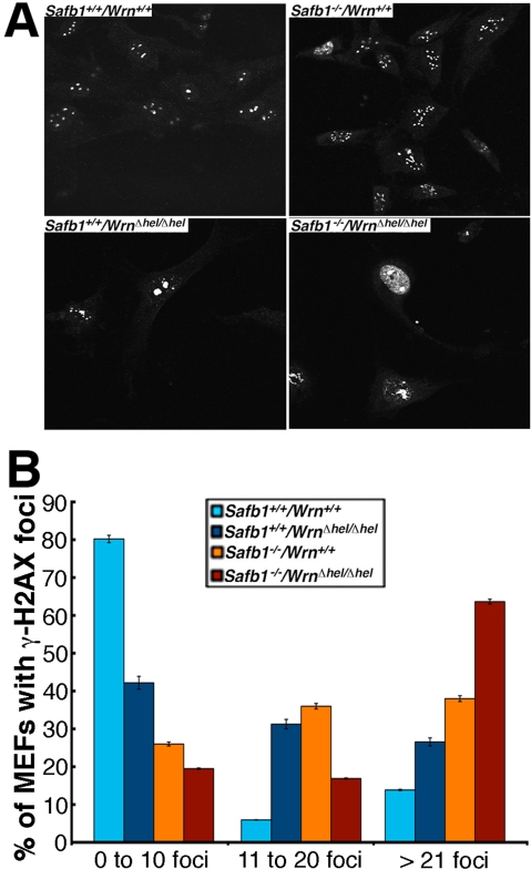 As DNA damage can induce senescence in normal fibroblasts [35], we quantified the levels of DNA strand breaks in the MEFs (three embryos of each genotype) at passage 5 (after approximately 10 population doublings) by immunofluorescence with an antibody against γ-H2AX, which marks double stranded DNA breaks [36]. As indicated in Figures 9A and B, the percentage of Safb1-null/WrnΔhel/Δhel MEFs with more than 20 γ-H2AX foci reached almost 65% after five passage in vitro. Interestingly, even though Safb1-null MEFs were immortalizeed, such cells exhibited more γ-H2AX foci than wild type and WrnΔhel/Δhel MEFs. More than 25% of WrnΔhel/Δhel MEFs showed cells with more than 20 γ-H2AX foci. In contrast, less than 15% of wild type MEFs had nuclei with more than 20 γ-H2AX foci. Approximately 80% of wild type MEFs had less than 10 γ-H2AX foci (Figure 9B). These results indicate that Safb1-null/WrnΔhel/Δhel MEFs displayed more DNA damage on average than Safb1-null, WrnΔhel/Δhel, or wild type MEFs.