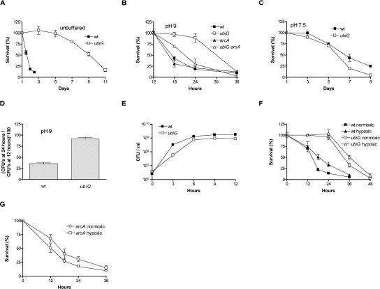 The excretion of amines, as a by-product of the metabolism of amino acids in LB, results in an alkaline pH (approximately 9) as a wt strain reaches stationary phase in this medium [12]. On the other hand, the ubiG strain reaches a stationary phase pH of approximately 7 (data not shown). Also, the saturating cell density of the wt strain is approximately 1.5 × 109 colony forming units (CFU) per ml, while the ubiG mutant reaches a density of approximately 8 × 108 CFU / ml (Figure 1E). The ubiG strain survives considerably longer than wt when no changes are made in the media of the two strains (Figure 1A). To dissect the effect of differences in stationary phase pH and cell density on the observed lifespan extension, we equalized stationary phase pH to 9 using the biological buffer AMPSO and stationary phase cell density to 1.5 × 109 CFU / ml for both strains. Though diminished in comparison to the unbuffered experiment, lifespan extension in the ubiG strain under these conditions is still significant (Figure 1B). On the other hand, when stationary phase cell density is equalized to 1.5 × 109 CFU / ml and stationary phase pH is equalized to 7.5 using the biological buffer HEPES, the lifespan of the ubiG strain is similar to that of wt (Figure 1C). Therefore, the ubiG mutation causes a lifespan extension only in an alkaline environment and we performed all subsequent experiments under these conditions. It is important to note that E. coli is exposed to alkaline pH in one of its secondary ecological habitats, seawater [13]. The growth curves of wt and the ubiG strain demonstrate that both strains enter stationary phase (cease proliferating) at approximately the same time (Figure 1E). Therefore, the observed lifespan extension in the ubiG mutant is not a result of delayed entry into stationary phase. Lack of ubiG also causes extended survival in the commonly used genetic background MG1655 (Figure 1D). It is worth noting that the stationary phase survival of the ubiE and ubiF mutants is intermediate between that of wt and the ubiG mutant (data not shown).