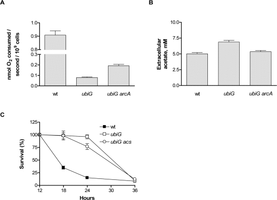 Acetate is one of the four metabolic by-products of E. coli under fermentative conditions, along with lactate, ethanol and succinate [16]. Since the ubiG mutant appears to adopt a hypoxia-like metabolism and because we previously showed that acetate production and uptake are required for the extended lifespan of the lipA strain [5], we measured the concentration of extracellular acetate in the ubiG strain and found it to be higher than that of wt. Deletion of arcA reverts the extracellular acetate concentration of the mutant back to wt levels (Figure 2B). Acetyl-coA synthetase, encoded by acs, is responsible for the uptake of acetate at extracellular concentrations lower than 10 mM and its conversion to acetyl-CoA [17]. Deletion of acs does not affect the lifespan of the ubiG mutant (Figure 2C); hence acetate uptake is not required for the longevity of this strain.