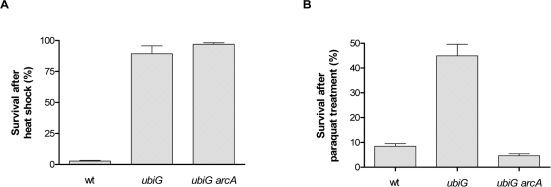 Long-lived organisms in several model systems have been shown to be resistant to thermal and oxidative stress [18]. The ubiG mutant is more resistant than wt both to heat shock and to treatment with the superoxide-generating agent paraquat in stationary phase. The paraquat resistance of the mutant is entirely dependent on ArcA, whereas the heat shock resistance is independent of ArcA (Figure 3). Note that ArcA also contributes to the paraquat resistance of the wt strain, albeit to a much smaller extent compared to the ubiG mutant. Therefore, ArcA regulates the lifespan, rate of oxygen consumption, extracellular acetate accumulation and paraquat resistance in the ubiG mutant.