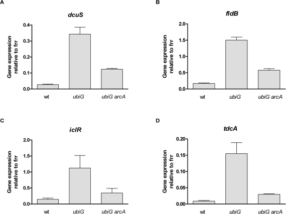 To test whether the expression of arcA is under the control of TdcA, we measured the expression of arcA in the wt, ubiG and ubiG tdcA strains. The expression of arcA is elevated in the ubiG mutant compared to wt and this elevation is not affected by the absence of TdcA (Figure 5D); therefore, the expression of arcA does not seem to be under the control of TdcA. The elevated expression of arcA in the ubiG mutant might be due to the derepression of the ArcB-ArcA phosphorelay in the absence of fully-formed ubiquinone [21].