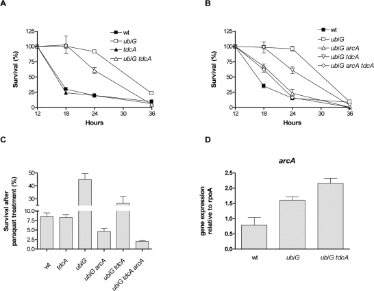In order to explore any effects of ArcA-regulated gene expression on the lifespan of the ubiG strain, we tested the effect of the deletion of the ArcA-upregulated genes on the survival of the strain. Deletion of dcuS, fldB, gatC, feoB, cybB or iclR has no effect on the survival of the mutant (data not shown). On the other hand, deletion of tdcA causes a partial reversion of the extended lifespan of the ubiG mutant, while the tdcA strain has a stationary phase survival similar to wt (Figure 5A). TdcA is a transcription factor regulating the anaerobic metabolism of serine and threonine [20]. We next explored the genetic interaction between ArcA and TdcA in the regulation of the lifespan and paraquat resistance of the ubiG mutant. As shown in figure 5B, the ubiG arcA tdcA mutant has a similar survival to the ubiG arcA strain, consistent with the hypothesis that ArcA and TdcA function in the same pathway to extend the lifespan of the ubiG mutant. TdcA also contributes partially to the paraquat resistance of the ubiG strain, since the ubiG tdcA mutant is more resistant than wt, but less resistant than the ubiG strain to a stationary phase paraquat treatment; TdcA has no effect on the paraquat resistance of wt (Figure 5C). The ubiG arcA tdcA mutant displays similar paraquat resistance to the ubiG arcA strain. Therefore, the data presented in figures 5B and 5C are pointing towards a single genetic pathway formed by the transcription factors ArcA and TdcA enhancing both stationary phase survival and paraquat resistance in the ubiG mutant. Furthermore, the regulation of both paraquat resistance and lifespan by a common genetic pathway suggests that these two phenotypes are physiologically interdependent.
