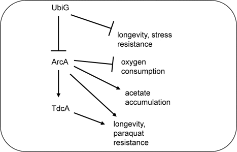 We previously reported a genome-wide screen for extended stationary phase survival in E. coli and showed that the hypoxia-inducible transcription factor ArcA and the Acs-PoxB bypass of the pyruvate dehydrogenase complex independently contribute to the longevity of a lipoic acid synthase mutant [5]. The ubiG mutant, lacking a gene required for ubiquinone biosynthesis, was also found to be long-lived based on that screen. Here we show that the extended lifespan of this mutant is also dependent on ArcA, but is independent of acetate uptake. ArcA also regulates resistance to the superoxide-generating agent paraquat, oxygen consumption, and extracellular acetate accumulation in the ubiG strain. A microarray analysis revealed that 16 gene ontology groups are suppressed by the action of ArcA in the ubiG mutant. Furthermore, several genes were found to be upregulated by ArcA in this strain. One of those genes, tdcA, contributes to the longevity and paraquat resistance of the ubiG strain. Epistasis experiments revealed that ArcA extends the lifespan and enhances the paraquat resistance of this mutant by directly or indirectly activating the transcription of tdcA (Figure 6).