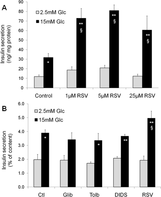 Resveratrol can bind to the sulfonylurea receptors (SUR), the regulatory subunits of KATP-channels [15]. Closure of KATP-channels promotes elevation of cytosolic Ca2+, secondary to the opening of voltage-gated Ca2+ channels, thereby inducing insulin exocytosis. Resveratrol is structurally similar to DIDS (4,4′-dithiocyanatostilbene-2,2′-disulphonic acid), a synthetic KATP-channel activator. Moreover, resveratrol treatment has been shown to displace binding of the sulfonylurea glibenclamide from SUR channels [15]. Therefore, one might speculate that resveratrol effects would be similar to those of sulfonylureas. In order to test this option, we exposed INS-1E cells for 24 hours to sulfonylureas (glibenclamide and tolbutamide), DIDS, and resveratrol. Glucose-stimulated insulin secretion was then tested in the absence of the compounds following the 24-hour treatment. As shown in Figure 1B, only resveratrol potentiated the secretory response, in accordance with previous data [14], showing that the chronic effects of this phenol are not mediated by SUR channels.