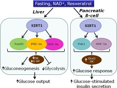 PGC-1α is another major target of SIRT1. In hepatocytes, PGC-1α induces gluconeogenic machinery and represses glucose consumption. In β-cells, PGC-1α over-expression reduces glucose metabolism and the accompanying secretory response, suggesting a switch to lipid utilization [36]. In diabetic animal models, PGC-1α is up-regulated in islets [36] and in the liver [37], resulting in increased hepatic glucose production. Regarding hepatocyte nuclear factors, treatment of insulin secreting cells with resveratrol induces HNF-1α gene expression, while HNF-4α is not affected [14].