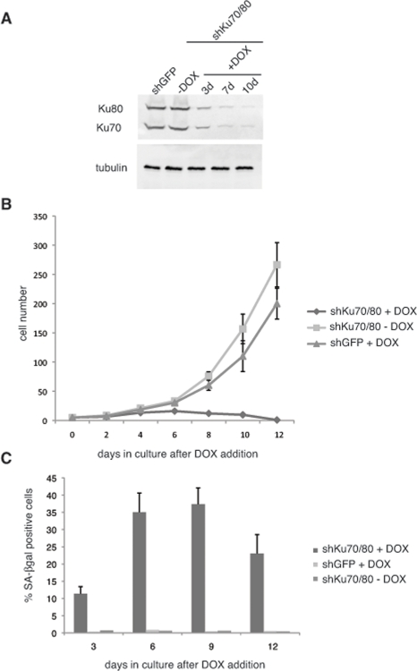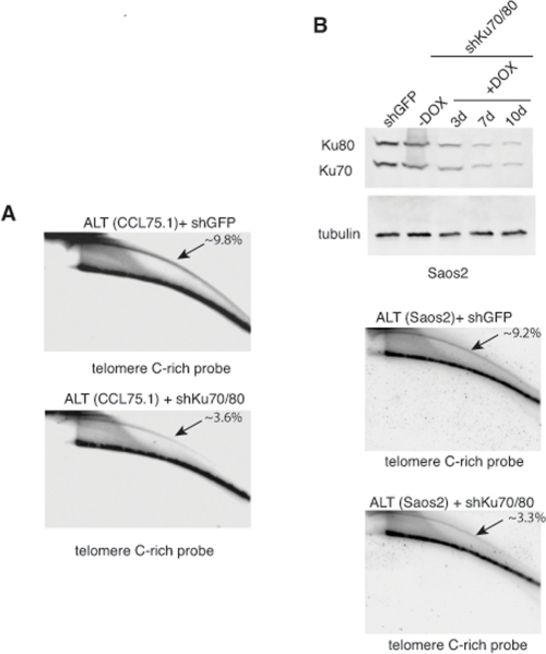 We set out to determine the effect of downregulation of Ku70/80 on ALT cell proliferation. For this purpose, we transduced CCL75.1 ALT cells with lentiviral vectors for the conditional expression of shRNAs targeting human Ku70 and Ku80. We reasoned that down regulation of both members of the heterodimer should prevent possible effects caused by the presence of free subunits. Transduced cells were subjected to Geneticin and hygromycin selections and the kinetics of Ku70/80 downregulation was monitored for 10 days following doxycycline (DOX) addition to the cell culture. As shown in Figure 1, within three days of induction, Ku70 and Ku80 levels decline more than 65% and then levels off to approximately 14% compared to control cells expressing shRNAs targeting an unrelated factor (GFP). Within this time frame, ALT cells transduced with the control silencing vector do not show any detectable difference in growth rate nor display morphological changes when compared to ALT cells culture in the absence of DOX (Figure 1b). In contrast, ALT cells expressing Ku70/80 shRNAs grow poorly when compared to either the same cells cultured in the absence of DOX or ALT cells expressing shRNAs for GFP treated with DOX, and the culture undergo proliferative arrest within 12 days after induction. During this time period, a significant number of cells display replicative senescence-like phenotype, exhibiting a flattened morphology, and between 25 to 35% of the cells stained positive for the senescence-associated β-galactosidase (SA-βgal) activity (Figure 1c). The percentage of senescent cells does not increase with passage but, rather, display a small decline, and the remaining cells eventually succumb to cell death (data not shown). The growth defects triggered by depletion of Ku70/80 in ALT cells resembles that caused by downregulation of the MRE11/RAD50/NBS1 (MRN) complex using shRNAs targeting MRE11 and NBS1 (Supplementary Figure S1). The MRN complex has previously been shown to play a role in the maintenance of telomeres in these cells, although knockdown of individual subunits of this complex results only in a slight decrease in proliferation [2, 15].