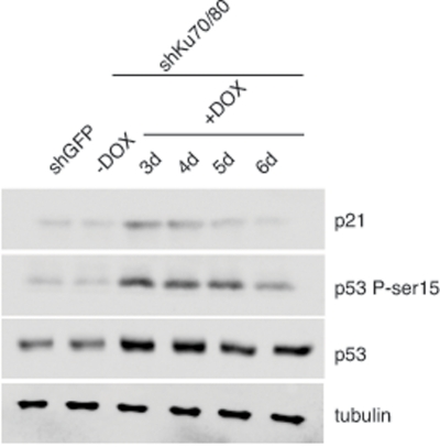 To determine whether the reduced cell proliferation is linked to cellular stress, we examined the levels of p53 and its downstream target p21 in cells lysates prepared from ALT cells transduced with lentiviruses for the conditional expression of shRNAs for Ku70/80 or GFP at 3 to 6 days after induction with DOX. Western blot analysis shows an increase in the levels of p53 in ALT cells depleted of Ku70/80 compared to controls (Figure 2). Moreover, the Ku70/80-depleted cells display a transient increase in the levels of p21 and phospho-rylation of p53 at serine 15, an hallmark of DNA damage-induced p53 activation. In contrast, the levels of p53, p21, and Ser15 phosphorylation do not change after expression of shRNAs targeting GFP. The cellular response to down regulation of Ku70/80 closely resembles that of ALT cells depleted of the MRE11/RAD50/NBS1 complex, as shown by analysis of ALT cells transduced with lentiviral vectors for the expression of shRNAs targeting MRE11/NBS1 (Supplementary Figure S2).