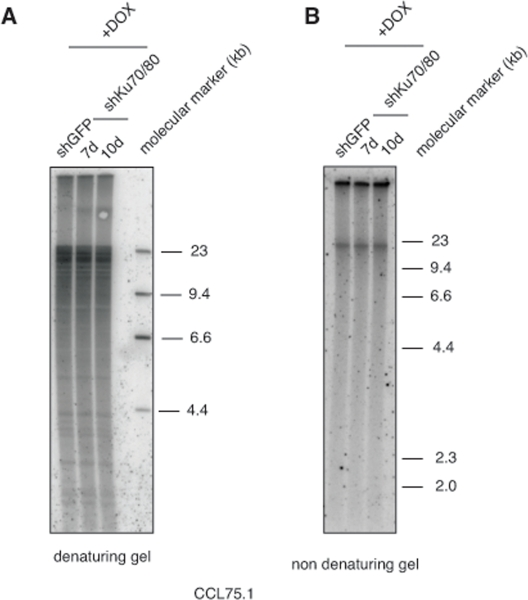 ALT cells trasduced with lentiviruses for the conditional expression of shRNAs for Ku70/80, NBS1/MRE11 or GFP were maintained in media containing 400 μg/ml Geneticin, 200 mg/ml Hygromycin, and collected 7 or 10 days after addition of 1.0 mg/ml DOX. Genomic DNA was isolated by standard protocols, and equal amounts of DNA were digested with HinfI and RsaI. Two micrograms of DNA was separated on 0.8% agarose gels, transferred to Hybond membrane, and hybridized with a radiolabeled (CCCTAA)4 probe. Blots were exposed on films or PhosphorImager screens, and telomeric repeat signals were quantitated with ImageQuant software (Molecular Dynamics, Inc.).