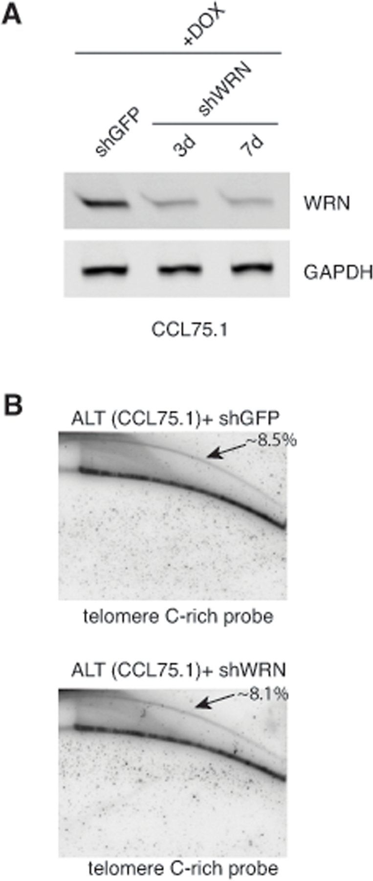 Genetic knock-out of the Ku80 gene in telomerase-positive human cells results in reduced cell proliferation and is accompanied by dramatic shortening and loss of telomeres [16, 17]. Moreover, 50% reduction in the expression of Ku80 either by small interfering RNA (siRNA) or by functional inactivation of one allele in two telomerase-positive carcinoma cell lines, HeLa and HCT116, is sufficient to alter telomere homeostasis, as demonstrated by rapid telomere shortening and, at least in one of the studies, stronger telomere overhang signal [16, 18]. To determine whether depletion of Ku70/80 influences telomere homeostasis in ALT cells, we measured telomere length, single-stranded telomere overhang signal and t-circles in ALT cells transduced with lentiviruses for the conditional expression of shRNAs targeting Ku70 and Ku80. Cells were subjected to selections and DNA was isolated before induction and at 7 and 10 days after DOX addition. DNA was digested with HinfI and RsaI, resolved on agarose gel and hybridized to a radiolabeled telomeric probe under either denaturing or native conditions. This analysis show that within the time frame of this experiment, depletion of Ku70/80 does not significantly influence overall telomere length or the single-stranded telomeric overhang (Figure 3). In parallel, DNA isolated from the transduced cells was separated by 2-dimensional gel electrophoresis (2-DGE) and probed with a radiolabeled telomeric probe. This analysis shows that depletion of Ku70/80 is accompanied by a significant decrease in the intensity of the arc representing extrachromosomal t-circles (Figure 4). To corroborate this finding, we analyzed telomere length, overhang signal and t-circles in another ALT cells line, Saos2, and show that, as observed in CCL75.1, depletion of Ku70/80 in Saos2 does not affect overall telomere length nor 3′ overhang but results in a significant decrease in the levels of t-circles (Figure 4 and Supplementary Figure S3). These results indicate that Ku70/80 downregulation negatively influences t-circle formation in ALT cells, thus implicating non-homology-based processes in t-circles homeostasis in these cells. In contrast, shRNA-mediated silencing of the Werner syndrome protein (WRN), a factor that binds to Ku70/80 and has been implicated in the repression of t-circles in telomerase-positive cells [14], does not alter the levels of t-circles in ALT cells (Figure 5). As a control we show that downregulation of MRE11/NBS1 in both CCL75.1 and Saos2 cells also results in a significant reduction in the levels of t-circles (Supplementary Figure S4), which is in agreement with published results [2].