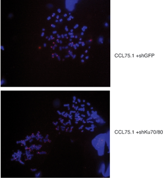 For chromosome spreads, CCL75.1 cells expressing shRNAs for Ku70/80 or GFP were treated with 0.5 mg/ml of colcemide for 1.0 hour, then harvested by trypsinization, and swollen in 0.075M KCl for 20min. The cells were fixed and washed with methanol:acetic acid (3:1) for three times. Metaphase chromosomes hybridization assays were carried out following the recommendation of the Telomere PNA FISH kit (Dako) supporting protocol. Chromosomes were counter-stained with mounting medium containining DAPI.
