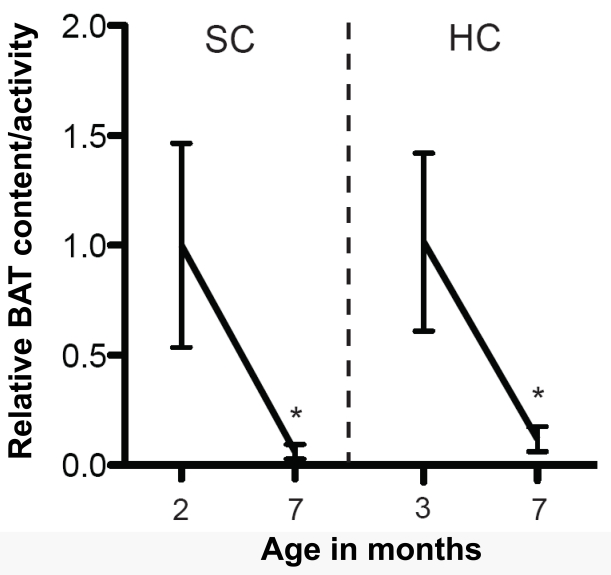 SIRT1 is abundantly and specifically expressed in metabolic-sensing neurons, including hypothalamic POMC and AgRP neurons [20, 21]. To directly test the functional relevance of SIRT1 in metabolic-sensing neurons on aging, mice bearing neuron-type-specific loss- or gain-of-function SIRT1 mutation will need to be generated. The effects of deletion of SIRT1 from either POMC or AgRP neurons on metabolic homeostasis have been reported; however, whether these mutations affect longevity is yet to be known [21, 22]. While we wait for these results to be available some guesswork can be made. For example, POMC-neuron-specific SIRT1 knockout mice display hypersensitivity to diet-induced obesity; a defect brought on by reduced sympathetic nerve activity and brown adipocytes content selectively in one visceral fat depot: the perigonadal fat [22]. It is important to emphasize that brown adipocytes are different from white adipocytes morphologically (brown cells contain multiple lipid droplets whereas white adipocytes have a sole large lipid droplet) and functionally (brown cells are highly oxidative as they convert chemical energy into heat via uncoupled respiration whereas white adipocytes stockpile energy) [23]. Interestingly, the amount/activity of brown adipose tissue (BAT) greatly varies with age: BAT content/activity is high early-on in life while it tends to decrease by age [24, 25]. Of note, we have also found an age-dependent decline in BAT in perigonadal fat; an effect that is however not accelerated by HC diet feeding (Figure 1). Our data suggest that in the context of HC diet protective mechanisms against visceral BAT loss are in place and that SIRT1 in POMC neurons is a critical component of these pathways [22].
