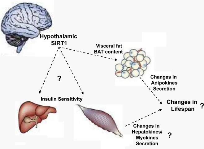 Due to the established roles of BAT on energy balance, the temporal decline in BAT content/activity could in principle contribute to the age-dependent increased propensity to accumulate adiposity. Because SIRT1 in POMC neurons selectively coordinates BAT in perigonadal fat SIRT1 in these neurons is well-placed to regulate at least one aspect of the aging process (i.e.: BAT decline in visceral fat). Seen from an “aging research” prospective, young-adult mice lacking SIRT1 in POMC neurons display an aged-like perigonadal fat because BAT in this tissue is virtually absent [22]. As mentioned above, this defect contributes to the development of energy imbalance (that is also a typical age-related illness) in the context of HC diet feeding. Thus, POMC neurons seem to regulate crucial aspects of the aging process in a peripheral tissue (BAT decline in perigonadal fat) and of the entire body (increased body adiposity). Whether the metabolically defective perigonadal fat tissue would have an impact on the lifespan of the organism is still unknown. However, due to their increased adiposity mice lacking SIRT1 in POMC neurons are expected to have a shorter lifespan compared to normal controls, at least in the HC diet feeding context that is the peculiar dietary environment of industrialized societies. If this prediction is true, in addition to be a key molecular component of defensive mechanisms against diet-induced obesity SIRT1 in POMC neurons will also need to be considered as a critical regulator of lifespan. Of note, hypothalamic neurons control other age-dependent parameters as for example hepatic and skeletal muscle insulin sensitivity that are also known to deteriorate with age. Indeed, via finely tuning vagus nerve activity hypothalamic neurons (including AgRP neurons) have been shown to orchestrate hepatic insulin sensitivity [26, 27]. Moreover, ventromedial hypothalamic (VMH) neurons have been reported to convey metabolic signals to skeletal muscle and as such coordinate insulin sensitivity in this tissue [28]. SIRT1 is expressed in AgRP and VMH neurons [20, 21], yet the relevance of SIRT1 in these cells on hepatic and skeletal muscle insulin sensitivity is unknown. Experiments aimed at directly testing the role of SIRT1 in these hypothalamic neurons on peripheral insulin sensitivity are needed. In addition to address an important question in the metabolic research field, results from these studies will eventually provide the experimental rationale for pursuing (or not) long-term studies designed to testing if hypothalamic SIRT1 also regulates aging. While we wait for these experiments to be completed the hypothesis that the metabolic-sensor protein SIRT1 in metabolic-sensing hypothalamic neurons is a key component of cell-non-autonomous mechanisms underlying lifespan remains an intriguing possibility (Figure 2).