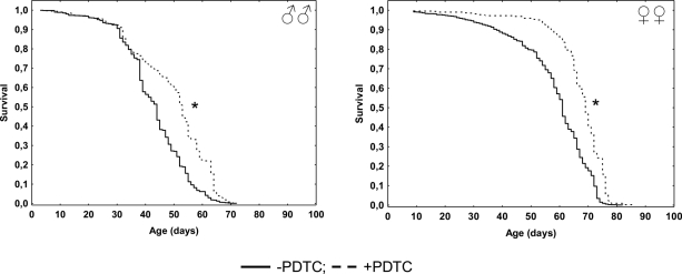 Pyrrolidine dithiocarbamate (PDTC, Sigma) was used as a specific inhibitor of the NF-κB transcription factor [16]. The experimental flies where treated with yeast paste containing 20 mg/l PDTC throughout the lifetime. Control flies were fed with yeast paste without PDTC.