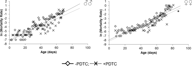 In males pharmacological inhibition of NF-κB results in an increase of the median (by 20%) lifespan, as well as the age of 90 % mortality (by 14%), compared to males that did not receive PDTC treatment (Table, Figure 1). At the same time, the age-dependent mortality rate was not affected (χ2 = 0; df = 1) (Table, Figure 2). In females, pharmacological inhibition of the NF-κB transcription factor causes an increase in the median (by 13%) and maximum (by 11%) lifespan, as well as the age of 90 % mortality (by 6%), compared to females that did not receive PDTC treatment (Table, Figure 1). The inhibition of NF-κB factor increased the average and median lifespan (by 11-13%). The statistically significant decrease in the age-dependent mortality rate was detected in females as a result of NF-κB inhibitor effect (χ2 = 62.6; df = 1) (Table, Figure 2).
